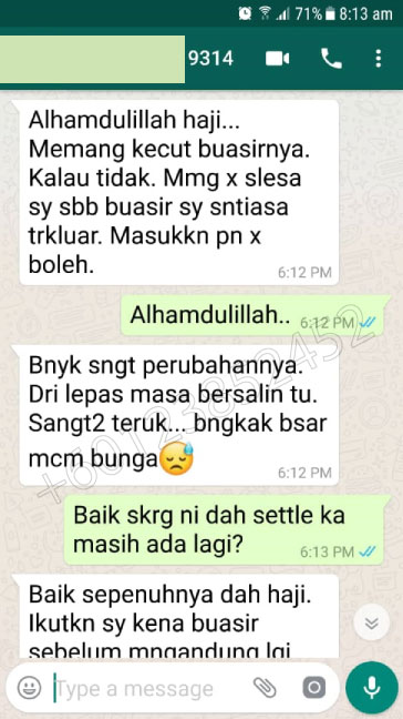 Setelah diambil ubat ini selama beberapa hari sahaja anda akan mengalami sendiri perubahan ketara yang akan terjadi, antara perubahan yang akan terasa ialah darah, titisan air dan juga lendir yang keluar mulai stop, bengkak luar dan dalam akan beransur surut sehingga tiada lagi bengkak tersebut, rembung yang terkeluar pun dah mula masuk balik.